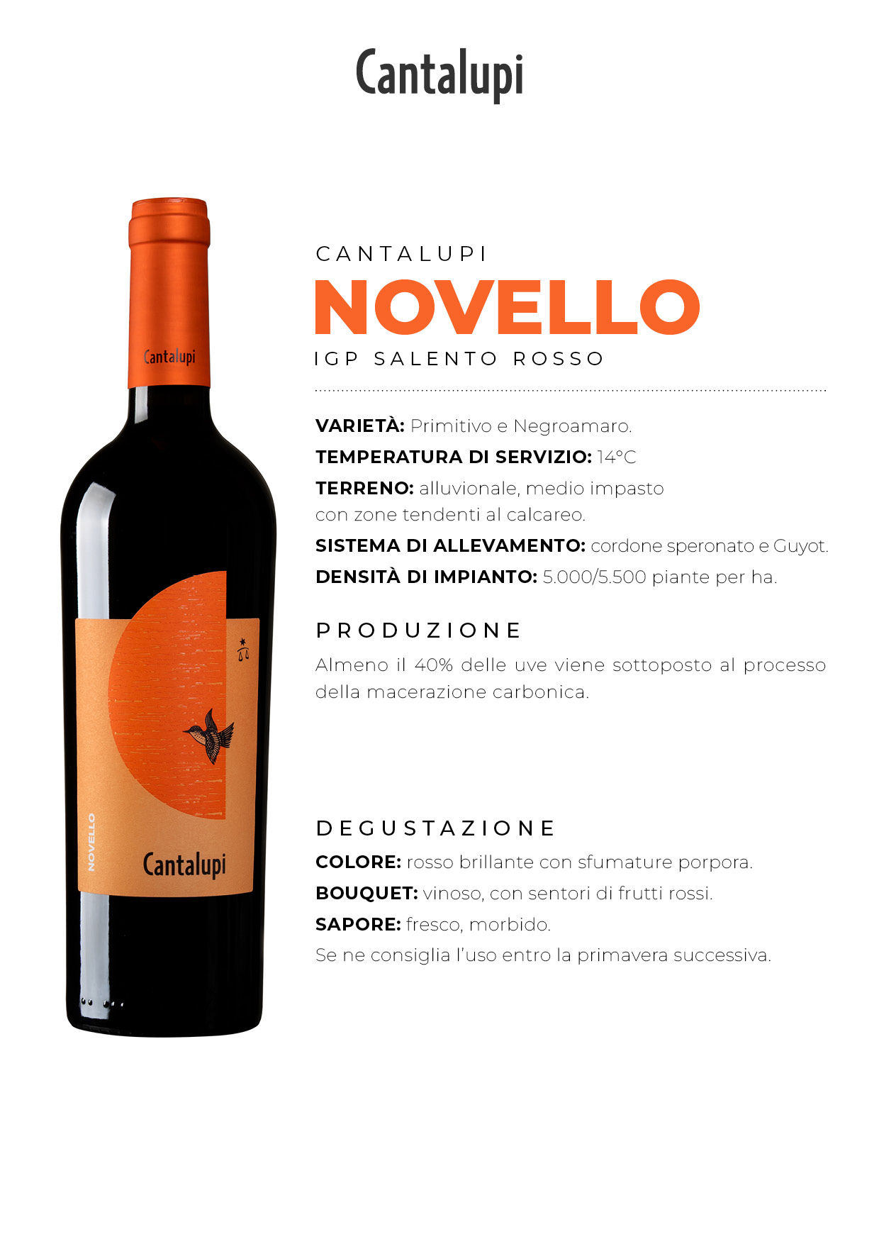 Affinché il vino possa essere chiamato Novello, la normativa prevede la macerazione carbonica per almeno il 40% dell’uva e il vino può essere messo in commercio dal 30 Ottobre dello stesso anno della vendemmia al seguente 31 dicembre.